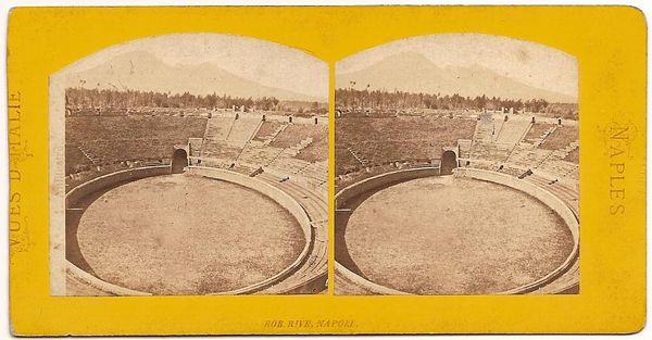 Roberto Rive captured this albumen print of the amphitheater in Pompeii sometime in the mid-19th century, using a process that was gaining traction for its sharp detail. The albumen method involved coating paper with egg whites, then sensitizing it with silver nitrate. The resulting print, made from a glass negative, has a distinctive tonal range and smooth surface, quite unlike the digital photos we're used to today. Look closely, and you’ll see how this particular process lends a slightly sepia tone to the image, emphasizing the arena's stone construction. The image is so compelling because of the contrast it establishes, the amphitheater was built by hand with slave labor, while the photo's own production hinged on skilled labor of a different kind and new industrial methods. The photograph is as much a record of Pompeii as it is of the rapidly changing world that Rive inhabited. It’s a reminder that every image, every object, tells a story not only of its subject but of the means and the moment of its making.