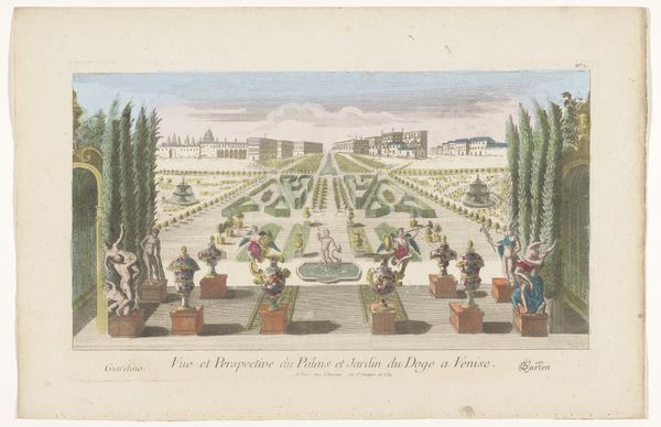 Basset created this print of a garden lane using etching and possibly other techniques, sometime around the late 18th or early 19th century. It gives us a glimpse into the visual culture of the time, particularly how power and status were communicated through imagery. The print depicts a meticulously designed garden, complete with fountains, sculptures, and neatly trimmed hedges. This garden isn't just a pleasant space; it's a statement. It reflects the wealth, taste, and authority of the Pope, who controlled Rome during this period. It is, in a sense, propaganda. The Catholic Church and the papacy were major institutions. Their social position was often reinforced and protected through such images. The formal, ordered nature of the garden mirrors the hierarchical social structure of the time. To fully understand a piece like this, we need to delve into the history of the papacy, the politics of Rome, and the role of art in shaping public perception. This print is a cultural artifact, and its meaning is deeply tied to the social and institutional context in which it was created.