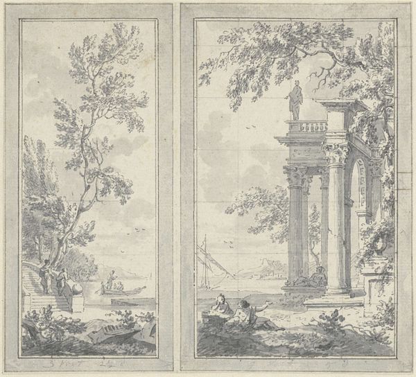 Curator: Peter Paul Benazech's "Classical Composition with Temple and Lake" presents a serene vista. It's watercolour on paper, measuring 225 by 335 millimeters. Editor: Immediately, I'm struck by the contrast: the rigid architecture against the soft, diffused light. It's a delicate balance of form and atmosphere. Curator: Considering Benazech's era, the late 18th century, these idyllic scenes were often commissioned by wealthy patrons, signifying their cultural refinement and connection to classical ideals. The paper and pigments he used would have been luxury goods. Editor: The way he uses light and shadow to model the columns and foliage is remarkable. The subtle gradations in the watercolour create depth and volume, almost defying the flatness of the paper. Curator: Indeed, watercolour became a medium of both the artisanal workshop and the aristocratic amateur. The mode of production reveals connections between social class, labour and artistry. Editor: And in the end, it's more than just a document of cultural aspiration. It's also a really lovely image, isn’t it? Curator: Precisely. The image evokes a mood of wistful contemplation.