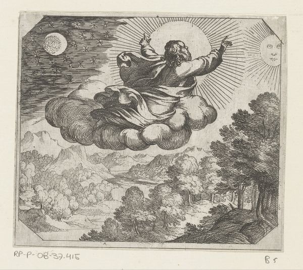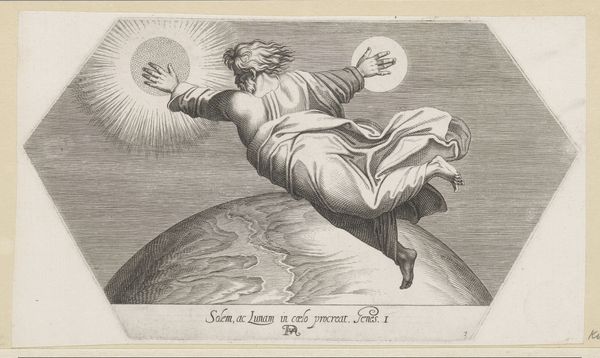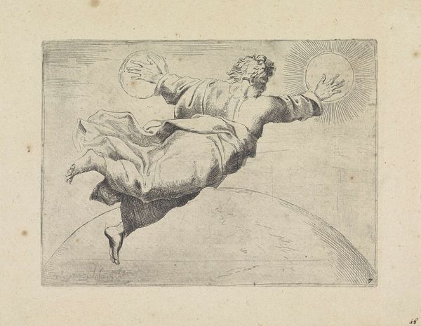 Cesare Fantetti created this print of God creating the sun and moon sometime between 1660 and 1675. The print’s visual codes, with God as a classical figure, reflect the cultural norms of the time. Religious art was a powerful tool for the Catholic Church, especially during the Counter-Reformation. This image serves as a visual affirmation of divine power. Fantetti was an Italian artist, and the influence of the Roman Catholic Church in Italy cannot be overstated. The church's patronage shaped artistic production, dictating themes, styles, and the overall message conveyed. This print, with its clear depiction of God's creation, aligns perfectly with the church's agenda, reinforcing religious doctrine and the divine authority that underpinned its power. To truly understand this print, we need to delve into the religious and institutional history of the time.