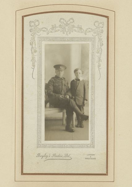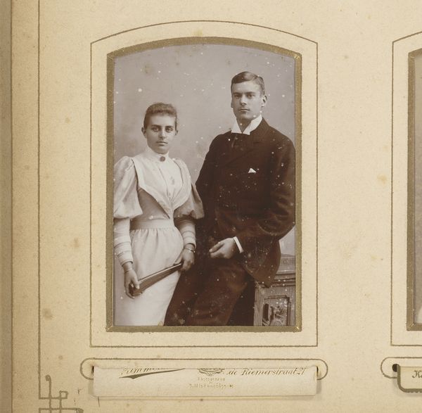 Curator: A rather stiff, formal portrait, isn’t it? The gelatin silver print, dating from 1860 to 1900, presents a couple, he in uniform. What are your initial thoughts? Editor: Austere. There's a tonal evenness throughout that subdues any dramatic play of light. The composition is centered, stable, perhaps hinting at the societal roles these individuals are expected to fulfill. Curator: Indeed. We see a classic power dynamic reflected in their positioning. He, the uniformed man, occupies a dominant, almost architectural stance, while she is subtly tucked to his side, hand gently placed on his arm. Her proximity underscores the expectations placed upon women to support male ambition in the late 19th century. Editor: And the framing too, that gold filigree feels like a proscenium, underscoring a performative aspect to their presentation. A statement. Is it an aspirational presentation? Curator: Precisely. Uniforms were potent signifiers of status and civic duty. This portrait, like many of the period, served to broadcast social standing and uphold institutional power. One imagines that such photographs provided opportunities to control the family’s narrative. Editor: It does give a fascinatingly controlled version of what they want us to think, though, to some degree, that emotional remoteness, what is left out, is as interesting as the composition. Is there anything in particular to the production technique that influences what we can observe here? Curator: Well, the rise of photography made such controlled representation newly accessible to the middle class. Gelatin silver prints offered a sharpness and clarity previously unseen. So photography also offered unprecedented possibilities for manipulating identities to fit societal molds, particularly about the gender norms we discussed previously. Editor: The surface of the image is smooth. This contrasts with our understanding of the rapid technological change in the Victorian era. Here is this supposedly new tool presenting as stolid, dependable. The romantic setting then softens a little; and her expression suggests something…beyond that facade. Curator: Perhaps a hint of the quiet strength required of women in a patriarchal structure? This portrait, beyond its formal constraints, does offer glimpses into the silent dialogues shaping the lives of those within its frame. The visual construction offers us insights into the social mores of the period but cannot contain what could also exist. Editor: A perfectly calibrated tension, a beautiful visual construct, indeed, that yields meaning to scrutiny but also poses unanswered questions, offering its secrets in both deliberate and veiled forms.