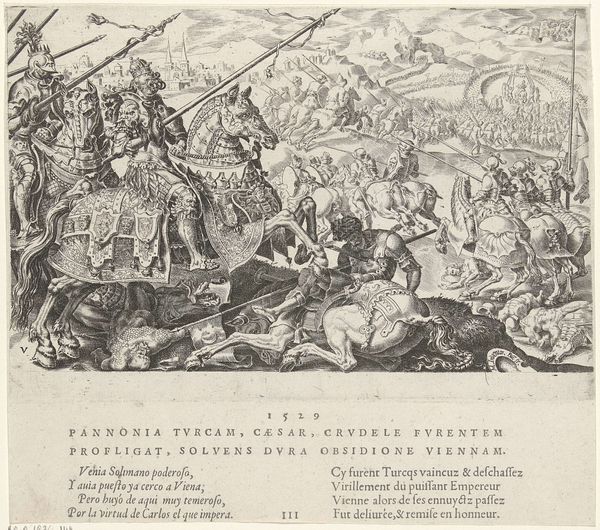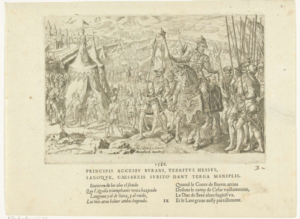 Curator: It feels like peering through time’s looking glass, doesn't it? This is "Keizerlijk kamp te Ingolstadt, 1546" or "Imperial camp at Ingolstadt, 1546," an engraving made sometime between 1555 and 1556. Dirck Volckertsz Coornhert really brings history alive, here at the Rijksmuseum. Editor: My first impression is of organized chaos, if that makes sense. All those figures meticulously rendered, yet there’s so much going on it’s almost dizzying. It makes me feel overwhelmed, but intrigued, all at once. Curator: Organized chaos… I like that! And chaos was, indeed, a factor! Coornhert depicts the encampment of Emperor Charles V’s forces during the Schmalkaldic War. Can you feel the political tension bubbling beneath the surface, a clash of empires? Editor: Absolutely. I see a very pronounced structure here. The figures in the foreground are densely packed but with some clarity, really drawing your eye into the chaos. It’s like they are characters in a play that are setting the stage for this historical backdrop of political events. Curator: Precisely! Think about it: this wasn't a photograph; it was crafted. Coornhert’s engraving technique – all those tiny lines building up the scene. It’s incredible how he captures the sheer scale of the army. Look at how the tents recede into the background… it’s an atmosphere. Editor: The use of hatching and cross-hatching is phenomenal here, I concur! These create gradations that evoke light and depth, and provide detailed surface textures and depth. A great example is how those foreground figures, seemingly simple in composition, really pop out in their rendering of garments and facial hair. Curator: And the narrative is subtly clever too. There’s no single, dramatic moment. It's more like an instant overview—a panorama almost, encouraging us to linger and piece the story together ourselves. Editor: The city looms in the background as a visual symbol, maybe suggesting themes of siege and power struggles in genre paintings? The emperor himself commands attention because he has taken charge. The horse motif can indicate stateliness, like we are supposed to associate some regal status with these historical figures in the genre and theme. Curator: It's incredible. A battlefield sketched with lines, shadows revealing the story underneath... Coornhert lets the viewer bring this period to life on their own, piece by piece, using a method that brings everything forward, and still maintains a grip on that deep perspective. Editor: Indeed. The technique creates the experience, ultimately guiding you toward contemplation in historical, religious, or moral allegory... I found this conversation intriguing!