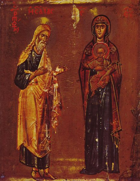 Curator: This tempera and ink work on parchment is titled *La Grande Prostituée s'énivre avec un Roi. Apoc. XVII*. Editor: Woah. It’s intense! That flat perspective, those slightly unsettling wide eyes...It looks like it's right out of a dream or some bizarre fever fantasy, especially with that bizarre cup held aloft. Curator: Indeed, this piece evokes powerful symbolic associations. We're viewing a depiction inspired by the Book of Revelation. Specifically, the passage that portrays the symbolic downfall of a great, corrupt city or civilization. The scene of intoxication speaks volumes about that fall. Editor: Intoxication, yes! Absolutely. This king seems willingly complicit. And "la Grande Prostituée"--what does her posture, her presence here, communicate to you? Curator: Her positioning, elevated above, symbolizes her influence over earthly powers. The visual elements draw parallels between earthly kingdoms and spiritual corruption in medieval thought, indicating institutional critique. The triangle above her head is an especially unique touch. Editor: The artist captured her eyes wide open. No remorse? No sense of guilt, and all that bright, flat color and strong confident line. I guess you could say she embodies pure temptation...I see her in board meetings all the time. Curator: In many ways, the artist uses very blunt figuration to present some extremely nuanced notions regarding institutional and spiritual corruption. This artwork asks what power structures enable or even promote societal decadence. The Book of Revelation became politically popular. Editor: Decadence is right! It feels potent. It makes me consider the subtle seductions in power all around us, doesn’t it? These medieval artists had a real flair for making these weighty ideas feel strangely immediate, urgent even! Curator: A fitting and reflective summarization! Indeed, art like this helps us understand and critique the world we live in.