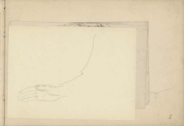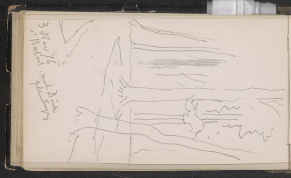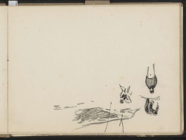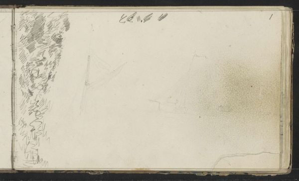 Curator: Anton Mauve created this pencil drawing, "Vissersboten bij de Kust" which translates to "Fishing Boats Near the Coast", sometime between 1848 and 1888. It resides here at the Rijksmuseum. Editor: The sparseness immediately strikes me. The almost ephemeral nature of pencil on paper beautifully captures the transience of the seascape. You can almost smell the sea air! Curator: It’s interesting to consider Mauve's choice of material. Pencil allows for a rapid, almost impressionistic capturing of a scene. This wasn’t some large-scale commissioned work; this was a quick sketch, probably en plein air, focused on the daily labour happening on the coast. How does the work's portability and ready medium speak to his intention as an artist? Editor: Precisely. These were likely studies done for future, more monumental oil paintings. Mauve's art career benefitted greatly from royal patronage and being part of The Hague School – artists focusing on realistic, often romanticised scenes of Dutch life for consumption by both national and international markets. So, while these look simple, they're integral to the construction of a certain national identity through art. Curator: Good point. The sketchiness also reveals Mauve's process. We see not just the finished product, but the marks of labour – the build-up of lines, the adjustments. How this differs from, say, a meticulously rendered history painting is also crucial to remember. These small sketches show the real work that's frequently overlooked. Editor: I'm also drawn to the contrast between the relatively defined boats and the abstracted background and initial sketch to the left. Did Mauve choose to highlight those specific figures? Was the blank side ready to accept additional work at a moment's notice? It's the tension between specific, situated realities and broader societal trends. These artistic depictions further solidified an image, and the cultural role these maritime workers embodied for an evolving Netherlands. Curator: Looking closely at "Vissersboten bij de Kust", we see it’s not just a representation, it is also, crucially, the evidence of material interaction – the graphite against paper, a moment in time preserved through the physical act of drawing. Editor: Yes, precisely; now I can't help but consider how that seemingly simple sketch embodies far greater historic forces.