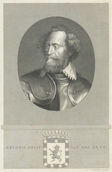Curator: Before us is a print titled "Portret van Adriaan Pauw," created between 1861 and 1863 by Jan Frederik Christiaan Reckleben. It resides here in the Rijksmuseum. Editor: My first impression is one of formality and reserve, even with the soft curls of his beard. The neutral grey and intricate detail convey a sense of dignity and authority but also a sort of removedness. Curator: Exactly. Reckleben chose engraving to capture the essence of Pauw, which speaks to tradition and perhaps a deliberate harkening back to the Dutch Golden Age, a time of significant political and economic power for the Netherlands. Note the symbolic elements—the coat of arms. Editor: Ah yes, the family crest! These emblems often carry a lot of weight. The arrangement suggests a concern with lineage and the consolidation of power. These visual signifiers root him firmly within a specific socio-political class. The decorations—that chain—aren't merely decorative; they denote status. Curator: Precisely. Medallions like that symbolize more than wealth; they represent merit and service to the state, reflecting not only on the individual but on the historical narrative of power itself. And Reckleben, by including such potent imagery, reinforces that narrative. Editor: I can’t help but consider who this portrait was made for. While it certainly monumentalizes Pauw's legacy, was it aimed at perpetuating an exclusionary image of leadership? Was it meant to reinforce established social hierarchies? Curator: A pertinent question. The intended audience significantly shapes its meaning. During that time, prints often served didactic purposes, solidifying existing structures, or indeed inspiring different interpretations, which perhaps Reckleben intended. It serves not just to show us Pauw but also the values he ostensibly embodied. It speaks volumes, both visually and psychologically. Editor: It leaves me reflecting on how these images from the past inform contemporary understanding of leadership and power. Curator: A powerful connection to draw. Editor: Indeed. Curator: Absolutely. The interplay of image and symbol in transmitting ideals. Editor: Makes one wonder how his legacy endures, even through the etching of this print.