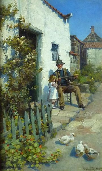 James Charles painted this scene, 'The Knifegrinder', during a time of significant social change in England. He captures a slice of everyday life, but it’s also a glimpse into the rigid class structure of late 19th-century England. The image depicts an itinerant worker, a knifegrinder, providing a service in a rural setting. Charles contrasts the working man with the two middle-class children observing him. Their clean, respectable clothing stands in stark contrast to the knifegrinder's worn attire. The painting's setting, likely a picturesque village, reflects the idealization of rural life popular at the time, yet the presence of the knifegrinder reminds us of the economic realities that underpinned this idyll. Understanding this artwork requires us to explore the social history of labor, class, and the changing landscape of Victorian England, all of which can be researched through census records and historical accounts. This piece invites us to consider the stories of those whose labor often goes unseen.