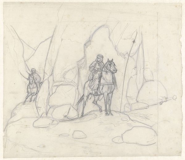Curator: This pencil drawing by Johannes Tavenraat, made around 1843-1844, is titled "Ruiter in historisch kostuum bij een fort op een berg"—or "Rider in historical costume near a fort on a mountain." It is currently held in the collection of the Rijksmuseum. Editor: Oh, it feels like a whispered legend. The soft graphite, almost translucent, hints at a grand tale only half-remembered. Is that a medieval knight out for a morning stroll with his dogs near the ruins of some old castle? Curator: Formally, it's fascinating how Tavenraat uses line and implied form to create spatial depth, particularly in the rendering of the mountain fort. The precise control over tonal variation is also crucial here. We should consider the overall composition and its implications; note how the arrangement pulls our eye from the left to the figure on horseback in the center and then to the human figure on the right, culminating at the implied landscape on the left horizon, forming a complete cycle. Editor: A cycle! That's good! I keep thinking of Don Quixote, or maybe a character from some old epic poem. There is a vulnerability about him, just on his face... even though he is mounted and noble-looking, that just leaps out, almost like this scene captures that moment between waking and dreaming when memories swirl into being. Curator: An interesting reading, although the artist's technique may shed greater light. The relatively muted contrast in tonal value directs emphasis to line. One could easily imagine the narrative elements present here—figures, architecture, and landscape—are, from a semiotic point of view, representative, existing here to indicate a larger truth about romantic history painting itself. Editor: Or perhaps a romantic soul simply yearning for stories from before… before what? Maybe a longing before industrialisation… but, yeah, your reading too has got some validity in itself, obviously. Curator: Undoubtedly a nexus of cultural memory, condensed. Editor: But to me, it's this sense of the incomplete that gets me – all the narrative threads that Tavenraat leaves untied, allowing me to dive into that realm and sort of co-create something between graphite, legend and me! I just adore that in art! Curator: I believe we’ve successfully articulated the core structure in dialogue today, focusing, as one should, on this masterly creation's intrinsic aspects while briefly examining various, theoretically informed contexts. Editor: Yeah! The dance between what it is, and what it maybe isn't... you just have to enjoy that!