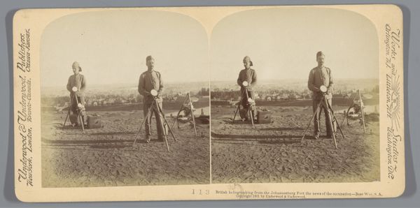 Editor: This gelatin-silver print, titled "Een soldaat naast zijn stervende paard onderweg naar Bloemfontein," was taken in 1901. It’s a poignant scene, almost unbearably melancholic. What historical context might give it even deeper meaning? Curator: This image captures a soldier with his dying horse, likely during the Second Boer War. But beyond a simple depiction of grief, it invites us to consider the romanticized narratives of warfare that often obscure the brutal realities of colonial conflicts. Notice how the photograph idealizes the bond between man and animal amid imperial violence. Doesn’t it provoke questions about power dynamics inherent in such a relationship, and moreover, the larger conflict? Editor: It does, actually. I hadn’t considered how it almost sanitizes war through that lens. It's presented as some beautiful sacrifice... Curator: Exactly! Think about the systemic dehumanization of colonized peoples often intrinsic to these portrayals. This photograph, produced by Underwood & Underwood, was intended for mass consumption via stereoscopes. How does understanding it as a form of propaganda shift its interpretation? Doesn't that alter our view on its seeming romanticism? Editor: Mass consumption for propaganda... It feels different now, almost manipulative. Seeing it as just a nice scene ignored the bigger, uncomfortable truths it downplays. Curator: Precisely! Recognizing its place within broader socio-political structures reveals the image's layered complexities, making it a powerful case study in the ethics of representation. It urges us to confront uncomfortable aspects of our shared history, doesn't it? Editor: It definitely does. I appreciate how you pushed me to look past my initial impression. Thank you! Curator: My pleasure. I think looking at art this way can change the conversation of how people perceive art’s role in the world today.