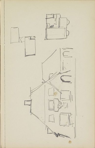 Editor: We're looking at "Architectuurstudies," or "Architectural Studies," a drawing by Cornelis Vreedenburgh made sometime between 1890 and 1946. It's a pencil drawing on paper and at first glance, it feels like peering into the artist's mind as he's brainstorming. The lines are so light and tentative. What catches your eye in this piece? Curator: It feels less like peering in and more like stumbling into Vreedenburgh's playful negotiation with space. He’s not just documenting buildings, is he? Look at the angles, the almost-there structures. There's a dynamism in those loosely defined forms. Is he remembering or inventing? What about you? Do you get the impression that he's looking at actual places, or perhaps conjuring them from his imagination? Editor: I lean towards imagining, the geometric forms almost appear as placeholders. The cityscape seems a bit more dreamlike. It doesn’t feel tied to a specific location. The arrow and numbers especially support the theory that it is from imagination. Curator: Dreamlike indeed! I imagine Vreedenburgh wasn't aiming for architectural precision; maybe he sought to distill the very essence of "city," of constructed space, of 'home'. Almost like musical notations on a stave, if home were a song? And notice, it is his mind "singing," rather than ours listening. Do you feel a personal resonance with any part of this composition? Editor: I do! The square building is simple but evokes some modern-day houses I have seen, with the geometric shapes. It has been a great conversation, thinking about imagination in the construction and depiction of architecture, or cityscapes! Curator: And for me, you know, your pointing out those familiar shapes, has been such a vivid way to think through an almost century-old work. This simple cityscape sings of a different world but echoes clearly our own.