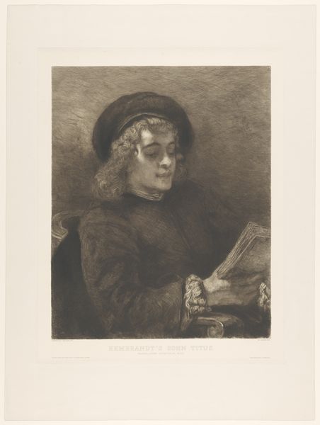 Editor: Right now, we're looking at "Portrait of Mrs. Sluiter-Metelerkamp," an etching and graphite print by Jan Veth, from 1891. It’s a somber portrait, mostly dark tones. What really strikes me is the intense concentration on the subject's face as she sews. What draws your eye? Curator: It’s a fantastic question! My eye immediately goes to her hands, and the soft interplay of light and shadow there. Notice how Veth renders the fabric almost ethereal compared to the rest of the piece. There’s something really intimate about watching someone absorbed in a simple, domestic task. Doesn't it feel like peering into a quiet, private moment? What do you think this reveals about Veth's view of the subject, of women of this period, perhaps? Editor: Absolutely. It's incredibly intimate! The hands suggest a lifetime of work. Maybe Veth is hinting at the value and dignity of everyday life, something easily overlooked? But is it idealized or realistic, in your opinion? Curator: That's a fabulous question! I think he elevates it through attention to detail, almost transforming it into an act of devotion. Though it doesn't shy away from showing the realities of aging or the plainness of dress, for example. What feelings does the work stir in you? Editor: I feel a sense of quiet respect. This wasn't just a commission; there’s genuine care in how Veth portrayed Mrs. Sluiter-Metelerkamp. Curator: Beautifully said. It feels like Veth allows her, and us, a space for quiet contemplation, a welcome moment outside the noise. Editor: This was so illuminating. I hadn’t considered the symbolism of everyday labor and how artists like Veth can find beauty in simplicity. Curator: And for me, your reading makes me think again about how time reshapes not only our perception, but the meaning itself of the artwork, and its invitation to reflect!