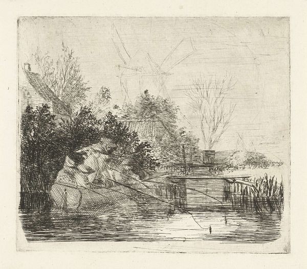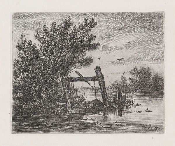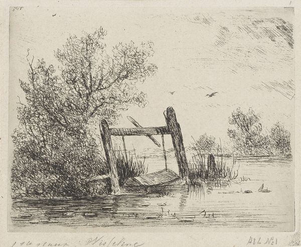 Johannes Pieter van Wisselingh created this work, "Visfuik aan een begroeide waterkant", using etching. In this seemingly simple image, we observe symbols of transition and decay. The broken fence submerged in water speaks to the transience of human constructs when faced with the enduring force of nature. Fences have always been a symbol of separation, and in turn, also safety. I am reminded of similar boundaries depicted throughout art history, such as the crumbling walls in Piranesi's etchings of ancient Rome, each representing a similar tension between the built environment and inevitable decline. Here, the fence leans precariously, almost surrendering to the water. This visual echoes humanity's vulnerability, as we strive to create order but are constantly confronted with natural entropy. It evokes a subconscious recognition of our fleeting existence in the face of timeless natural processes. The image captures a moment of melancholic contemplation, a meditation on time and the cyclical return to nature.