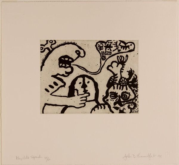 This lithograph by Pierre Alechinsky presents a troupe of figures, evoking the characters of a symbolic drama. The jester-like figures, with their elaborate headgear and expressive gestures, remind us of the Commedia dell'Arte. These characters, archetypes of human folly and wit, have their roots in ancient theatrical traditions. Note the swirling, almost organic forms that crown their heads, and their gestures, both defiant and playful. These evoke a sense of carnival, where social hierarchies are temporarily inverted, and the irrational takes center stage. Consider how, from antiquity through the Renaissance and into modern times, the fool or jester has served as a mirror to society, reflecting our anxieties and desires through satire and parody. These figures, like those found in tarot cards or medieval tapestries, tap into a collective unconscious. They appear as the embodiment of chaos and creativity, and invite us to question the boundaries of reason and madness. It is as though Alechinsky has captured a fleeting moment from a timeless spectacle.