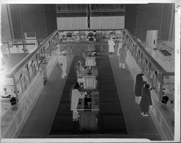 Curator: This photograph, by Martin Schweig, captures three men engrossed in construction within a vast warehouse space. Editor: The monochromatic palette gives it a ghostly, almost dreamlike quality, despite the very practical scene it depicts. Curator: The unfinished framework creates a grid, fragmenting the figures and drawing our attention to the process of building itself. Think of the symbolic implications of construction—building up, making anew. Editor: Yes, but who benefits from this construction? It's essential to consider the labor and the socioeconomic context. Are these men fairly compensated? What does their work contribute to the larger power structures at play? Curator: Perhaps the starkness emphasizes the foundational nature of their work, the often unseen labor upon which structures, both literal and societal, are built. The warehouse itself becomes a symbol of potential, waiting to be shaped. Editor: And maybe that potential also carries a burden, a reminder of the constant cycle of building and deconstruction that defines our relationship with progress and class. Curator: It’s a somber yet reflective image. Editor: Leaving us to question the narratives of progress.