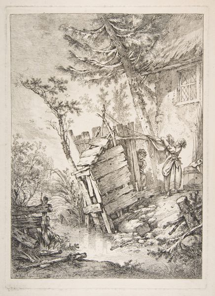 Editor: This etching, "Rovine d'antichi Edifizj" or "Ruins of Ancient Buildings", is by Giovanni Battista Piranesi, likely from 1743 or 1744. It feels quite theatrical, almost like a stage set depicting a fall of civilization. What's your interpretation of this fallen grandeur? Curator: Exactly! Piranesi wasn’t merely documenting ruins; he was staging a dialogue between past and present, power and decay. How does this imagery of the "fall" resonate with contemporary anxieties about cultural loss, perhaps anxieties around shifting global power? Editor: Well, looking at this, I can't help but think of climate change and the potential collapse of modern societies, how future generations might see our monuments in ruin. Curator: Precisely! Piranesi's ruins can be seen as a critique of power structures and the fleeting nature of empire. But more than just that, the artist’s choice of etching brings forward class issues. Who has access to these grandiose reflections, and what does that gatekeeping mean? Editor: So, the act of documenting and disseminating these images becomes a political statement? Curator: It certainly can. Consider who commissioned these prints, who consumed them, and what ideologies were being reinforced or challenged. The scale, the almost romantic depiction of decay—it all speaks to a fascination with the past but also a particular vision of the present. Are we equally attentive to the decay happening right now? What gets valorized and what gets erased in the narratives of history? Editor: I see. It’s not just a picture of ruins; it's a question about the narratives we build around power and history. I hadn't considered the role of printmaking itself. Curator: Absolutely. And remember, every depiction is a choice, a perspective. Editor: Thanks, I’m going to rethink how I view landscape art moving forward. Curator: It’s all about context and constantly questioning our assumptions.