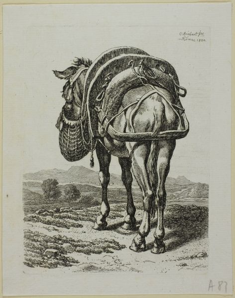 Here we have an etching of a man with a donkey, created by an anonymous artist. The donkey, burdened with a saddle, stands quietly while its master rests. This image is ripe with symbols of labor, patience, and the bond between humans and animals. The motif of the donkey, often associated with humility and endurance, can be traced back through centuries of art. In religious contexts, we recall Christ's entry into Jerusalem upon a donkey, a symbol of peace and unassuming authority. Yet, the donkey has also been portrayed as stubborn or foolish, a beast of burden carrying the weight of the world. Observe the man's repose. His relaxed posture suggests a moment of respite. This simple scene becomes a tableau of daily life, inviting viewers to reflect on the cyclical nature of work and rest, a theme that resonates across cultures and through time.