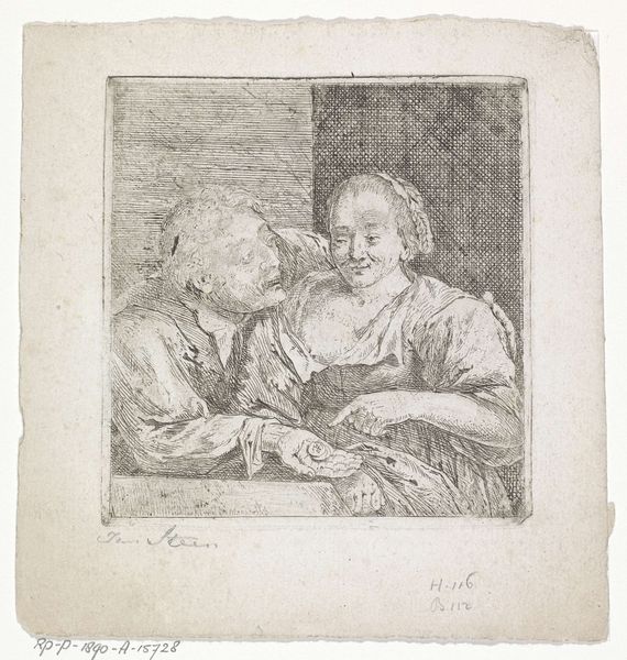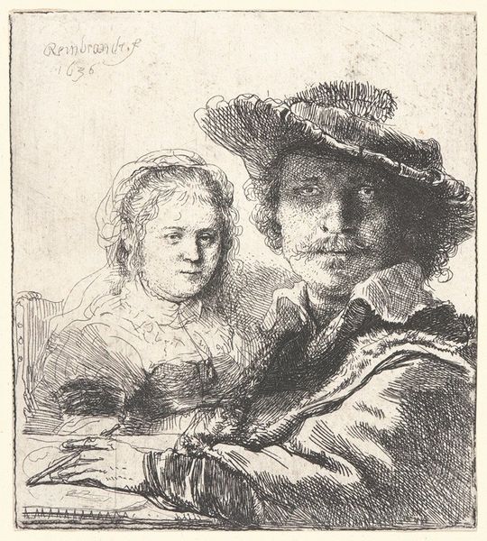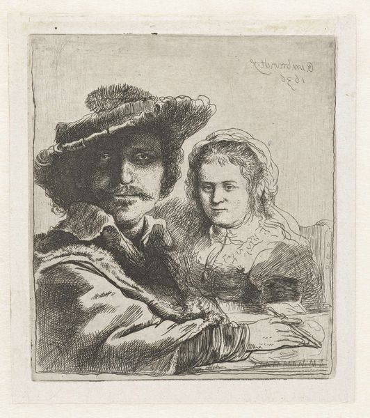 Here at the Rijksmuseum is Ignace-Joseph de Claussin's rendering of 'Self-portrait with Saskia and the artist's mother seated at a table, looking right: three quarter length'. This monochromatic etching measures a mere 115 by 100 millimetres and is a masterclass in the art of suggestion. Claussin deftly uses line and shadow to evoke form and texture, creating a compelling tableau. The composition, tight and intimate, draws our eye to the interplay between the three figures. There is the artist himself, Saskia his wife, and his mother, each rendered with a striking immediacy. What strikes one most is the dynamic tension achieved through the formal arrangement of figures and the contrast of light and shadow. There's a tension between the intimate domestic scene and a broader social commentary. The medium is no accident, the sharp, etched lines lending themselves to a semiotic study of family dynamics and the artist's role within. Ultimately, this small etching serves as a window into a complex interplay of personal identity and societal roles. It’s a testament to how formal elements can articulate profound cultural narratives.
