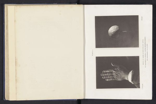 Curator: Right, let’s dive in. This intriguing print is called "Siersteen en achterhoofd van een menselijke schedel" or "Stone and Occiput of a Human Skull," created before 1869 by an anonymous artist. It's a photograph, technically a print made from a photograph. It presents us with something stark. What jumps out at you? Editor: Eerie elegance. I’m struck by the composition. The floating skull fragment and stone ornament seem suspended in this velvety abyss, like cosmic relics. There’s a quiet gravity to it, even in its photographic representation. Curator: It's definitely intended to evoke a sense of history. These kinds of photographic prints were important for documenting archaeological finds, circulating knowledge, and constructing narratives about ancient cultures and the Seine region in France. Consider how photography was developing as a scientific tool. Editor: Scientific, yes, but also... poetic, in a morbid sort of way. I'm drawn to the textures, aren’t you? The grainy details on the bone, the roughness of the stone—it hints at age and the passage of time but there is a touch of darkness also. Curator: The "academic art" style and theme reflect a fascination with the ancient world, especially anything unearthed within expanding European territories or, in this case, closer to home. Think of it within the context of 19th-century archaeology and the emergence of museums. These images would have helped solidify a visual understanding of history for a wide audience. Editor: So, it’s like a record, an early attempt at visually documenting what was lost to the past and creating something new. But does it find life beyond that single function, somehow? For me, there is something undeniably artistic to it as well. It leaves a bit of space for reflection, beyond what it wants us to acknowledge on the surface. Curator: Absolutely. That tension between objective documentation and artistic interpretation is what makes it so interesting. Editor: It reminds us that our current vision of the past is literally built on fragmented pieces. Food for thought. Curator: Indeed. And a reminder of photography's complex role in shaping that vision.