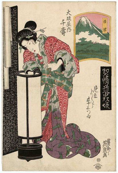 Keisai Eisen created this woodblock print depicting Kaoyo of the Tamaya house, sometime in the 19th century. It’s part of a series that cleverly references a popular board game, linking courtesans to stops along the Tōkaidō road. The print offers a glimpse into the licensed pleasure quarters of the Edo period in Japan. By portraying courtesans in relation to specific locales, it subtly maps desire onto the landscape. Look at the elegant garments, hairstyles, and the shamisen at her side. These details spoke to the complex social hierarchies and cultural practices of the time. This image isn't just a pretty picture; it’s a carefully constructed representation of social and economic realities. How did the artist use composition, color, and symbolism to convey these ideas? The historical context of the Edo period and the institutional frameworks that shaped the lives of courtesans are essential for understanding the artwork’s deeper meanings. We can consult historical documents to learn more about the Tamaya house. This kind of research helps us understand how art is always embedded in its social and institutional context.