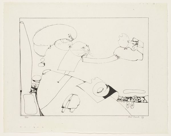 Curator: Before us we have David Smith's "Untitled (Virgin Islands)," a 1933 ink drawing. Editor: Intriguing. At first glance, there’s a dynamic interplay between boldness and fragility, a dialogue between the stark black forms and the delicate pen lines. Curator: Smith's command of line is undeniable. The contrasting textures, where meticulous cross-hatching meets open contouring, generate visual interest, highlighting the push-and-pull between geometric structure and organic shapes. Editor: Yes, there’s an underlying current reflecting the historical moment. Consider the social context of the 1930s. This abstraction, while not explicitly representational, gestures towards modern anxieties and a changing world order. Did the Virgin Islands, recently under US control, become symbolic to Smith, perhaps representing an encounter with the alien and the unknown? Curator: I observe that even within its abstraction, there’s an internal logic to the arrangement of forms and a structured relationship between figure and ground. This prompts considerations of formal elements beyond mere representation. Note the shapes, rhythm, and negative space. Semiotically, one could interpret this play of absence and presence. Editor: Your focus on the 'internal' minimizes its dialogue with external reality. Art doesn’t occur in a vacuum. Smith’s engagement with the islands—the political reality of this space— surely seeped into his artistic choices, making it far more than just forms on a page. He certainly traveled in politically turbulent social circles at the time, deeply informed by Marxism and left wing thought. Curator: Though I appreciate that biographical insight, it risks overshadowing the composition's independent aesthetic value and elegance. The artist's intentions, or the events of that decade, may be irrelevant. One could still perceive its intrinsic power without knowledge of geopolitical forces. Editor: Perhaps, but museums especially carry a great weight. Choices surrounding which works they celebrate and share are in fact political endorsements that cannot be separated from any pretense of objectivity. Curator: Indeed, those choices speak to shifting tastes and enduring legacies, and thanks to such spaces this composition's compelling formal dynamics still invite contemplation today. Editor: Precisely, which compels us to understand better the circumstances surrounding its making and viewing.