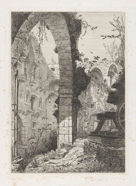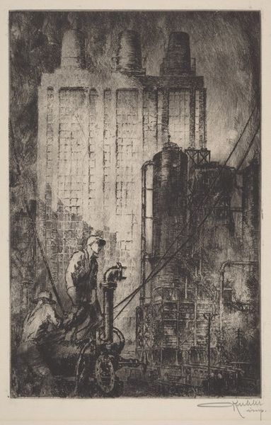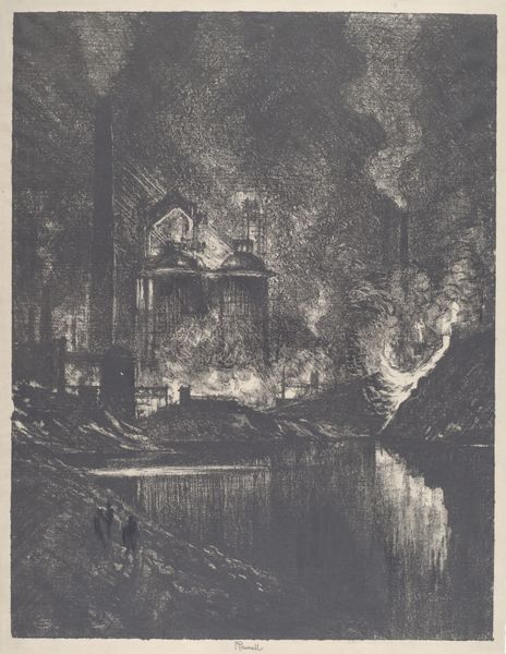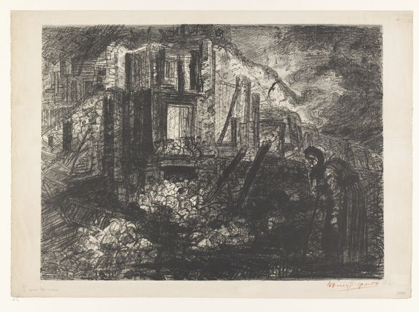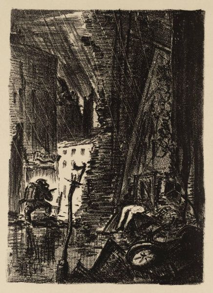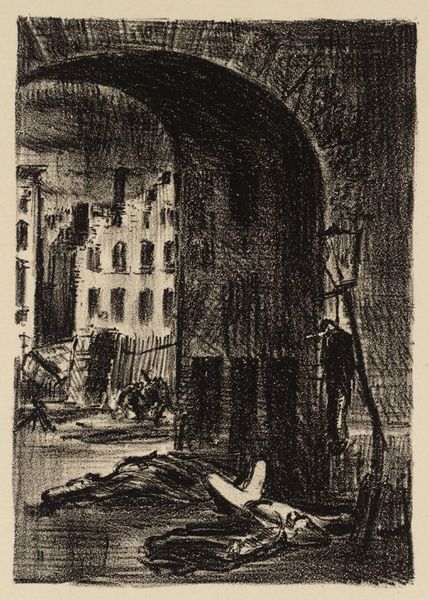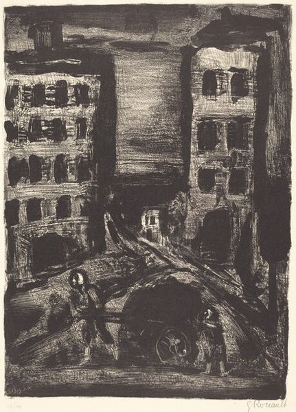 Curator: This is "The Fall of London: The Colosseum" by James Boswell. Editor: Bleak! It gives me such a feeling of overwhelming urban dread, rendered in what looks like crude strokes. Curator: Indeed. Boswell, born in 1906, used these stark, almost brutal, printmaking techniques to convey powerful social commentary, especially about the effects of war on the working class. The material itself speaks volumes. Editor: The Colosseum, usually a symbol of Roman grandeur, feels transplanted and corrupted here. See how that dark flag looms, and how figures scramble in the foreground. It evokes not triumph, but a disturbing collapse of order. Curator: Exactly. Consider the social context—the looming threat of war and its impact on societal structures. The print becomes a testament to the fragility of human achievement. Editor: Seeing those forms, their terror feels timeless, doesn't it? Even now. Curator: Yes. A poignant reminder of what we risk losing. Editor: A stark vision, powerfully conveyed.