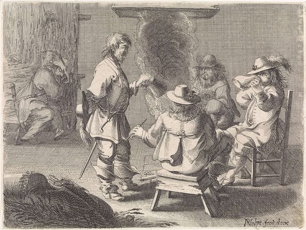 Curator: Here we see “Oyster and Seafood Seller”, a watercolor piece completed in 1822 by Saverio della Gatta. Editor: My first thought is… nighttime picnic, with a theatrical flourish! It's strange, beautiful, and a little unsettling all at once. Curator: Notice how Della Gatta captures a scene of commerce against an almost dreamlike sky. The interplay of light – moonlight and torchlight – casts an eerie glow, yet it's grounded by the lively activity of the figures. This blends the fantastical with the everyday. Editor: Absolutely. It’s romantic, not just in the historical art sense, but there is something so appealing to a contemporary viewer, the almost-unreal tone of the event creates intrigue and asks me what it is to feel at this night market. The vendor looks like he's about to burst into song! Is he trying to tempt these nighttime nibblers? Curator: His vibrant clothing and exaggerated stance lend him a Commedia dell'arte air. This style of acting could signify trickery, performance, and improvisation – how do we read these actions now that could hint at societal expectation back then? How does performance sell these items to the customer? Editor: Good points! Are these people simply customers, or complicit audience members enjoying an entertaining evening? Also, notice the single candle and small bucket near the foreground women; it is the everyday that brings the fantastical vendor down to earth again. They balance each other perfectly and offer us insight into both extremes and possibilities. Curator: Indeed. It's this merging of high and low culture, combined with the symbolic use of light and shadow, which makes the piece resonate. What do you walk away thinking? Editor: I’m thinking this wasn’t just dinner—it was a SHOW. We were never simply consumers and are always consuming experience. I can hear the bartering of oysters already! What’s on your mind? Curator: I think it also speaks to our enduring fascination with the theatricality of everyday life. There’s a sense of both delight and caution conveyed, reflecting complex aspects of commerce and community from nearly two centuries ago.