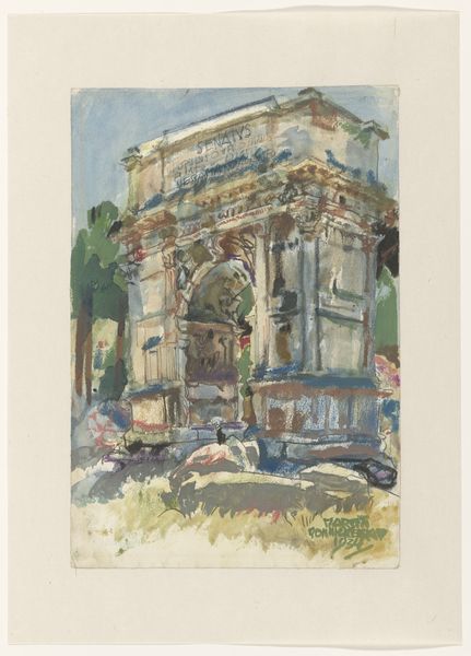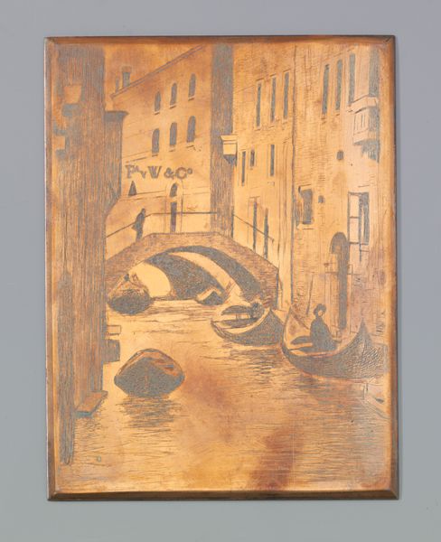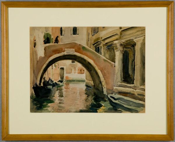 Curator: Florence Vincent Robinson's watercolor, "Street Scene in Venice, Italy," renders a quiet slice of Venetian life. Editor: Immediately, I’m struck by the tranquil mood—it feels like a stolen moment in a bustling city. The soft washes create an almost dreamlike quality. Curator: The choice of watercolor as a medium is critical here. It allows Robinson to capture the light reflecting off the water and the weathered textures of the buildings. Consider the commercial networks and trade in pigments that made such images possible. Editor: Absolutely, and it gives the scene a sense of lightness, almost as if the city itself is floating. I love the figure seated on the steps—they add a human element to the architecture. It makes me wonder about their story. Curator: Robinson’s work, though seemingly straightforward, participates in a much broader tradition of representing Venice for a consuming Western audience. Editor: It truly captures the essence of Venice, doesn't it? Curator: It certainly provokes consideration of how Venice came to be seen.