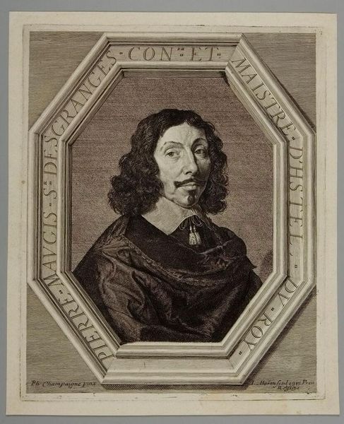 Curator: Up next, we have a portrait of Pierre Maugis, seigneur des Granges. This engraving, likely created between 1605 and 1650, is attributed to Jean Morin, and it's currently part of the Metropolitan Museum of Art's collection. Editor: My initial impression is somber. The limited tonal range—the stark contrasts between light and dark—creates a dramatic effect. It feels very contained, formal even, by the very geometrical and elaborate frame around the subject. Curator: The frame itself is significant, containing text that identifies Maugis and his role as "Maistre d'Hotel du Roy"–Master of the Royal Household. The visual emphasis reinforces his status. Editor: That's fascinating because the choice of engraving, a readily reproducible medium, contrasts with the aristocratic subject. How does that tension function socially? Was it intended for wide circulation? And think of the labor! Every line, every detail meticulously etched... Curator: Indeed, engravings allowed portraits, typically accessible only to the wealthy, to circulate among a broader audience, even if it remained an elite one. Consider, too, the persistent appeal of portraying powerful men and the ideals associated with masculinity across centuries. Editor: The texture! You can almost feel the etched lines, even virtually. And the way the light plays across Maugis's face and the folds of his garments gives real depth using a flat medium. This makes me appreciate the artisanal skills involved at this scale in the making process. It invites an inquiry into the circulation and use of such portraits. Curator: The portrait encapsulates a moment in time. Maugis’ features, hairstyle, and attire contribute to his character. Beyond just recording appearance, the images, lines and even medium signal codes of the court life. The artist had captured not just a person but the aspirations and beliefs attached to identity in his time. Editor: So, from material to symbol! That layering of historical markers tells a powerful story. Thanks to this image, Maugis, his title and position is not completely forgotten in history, as if engraving itself created a collective and popular memory of status through reproduced portraiture. Curator: Exactly! Seeing his status memorialized with text also hints to what they deemed important. It has certainly enriched my understanding of the layers beneath its surface.