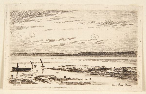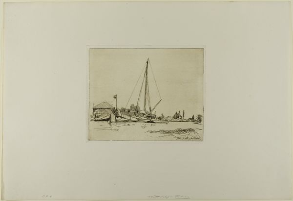 Curator: Here we have “Boats in a Harbor,” an undated print currently residing at The Art Institute of Chicago. The artist used etching on paper to create this cityscape. It certainly evokes a specific moment, doesn't it? Editor: Yes, instantly, I am drawn to the scene's serenity. Despite being a harbor filled with boats, there is a stillness to it, a tranquility that belies the often bustling nature of such a place. The monochrome adds a timeless, almost dreamlike quality. Curator: The absence of a specific date does contribute to that feeling. It's easy to imagine this scene unfolding in almost any century. The prominence of sail suggests a period before full industrialization changed shipping. Perhaps we're seeing a particular shift in harbor usage with sailboats and early steamships, potentially shaping the commercial future. Editor: I find the placement of the boats, both individually and in relation to the harbor skyline, to be symbolic. Note the size differential, indicating levels of power; it is almost an ancestral relationship within a human story. Do you see what seems like a church steeple is in the near-center as a signifier, maybe of colonial history? Curator: Interesting reading into scale dynamics. A cultural perspective informs my looking, prompting thoughts of port cities as nodes of trade and political discourse, both centers for commerce and as places marked by social division. Those smaller boats could represent the individual merchants while the larger ones carry the flags of empires. Editor: The etching technique, so meticulous, almost miniaturizes the world here, it really reinforces that sense of looking in on the past and holding that memory in the palm of our hands. Curator: Etching also lends itself to affordable reproduction. Prints like this democratized art ownership, reflecting a burgeoning middle class wanting images of industry and aspiration in their homes. This wasn’t art for palaces; it was art for parlors. Editor: And what an intriguing scene. "Boats in a Harbor" offers more than meets the eye—a peaceful yet busy slice of the world filled with memory and history. Curator: Indeed. This harbor scene allows us to think about the history and commerce while perhaps inviting us into that dream of tranquility and freedom.
