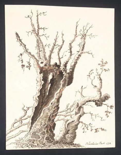 Editor: This drawing, simply titled "Tree" by Alphonse Nicolas-Michel Mandevare, is rendered in pencil, and the gnarled form of the tree feels almost like a human figure. What might Mandevare have been trying to convey through this depiction? Curator: Considering Mandevare's historical context, the tree could symbolize resilience. During the tumultuous period following the French Revolution, representations of nature often carried symbolic weight, reflecting societal anxieties and hopes for renewal. Editor: So, the tree isn't just a tree, but a symbol of something larger? Curator: Precisely. Think about how landscape painting, particularly drawings, gained popularity during this period. It offered artists a way to engage with national identity and express political sentiments through seemingly innocuous subjects. Editor: I see. So, in a way, this drawing is participating in a broader conversation about French society and its relationship with nature. Thanks, that gives me a lot to consider. Curator: My pleasure. It's amazing how art can reflect the times.