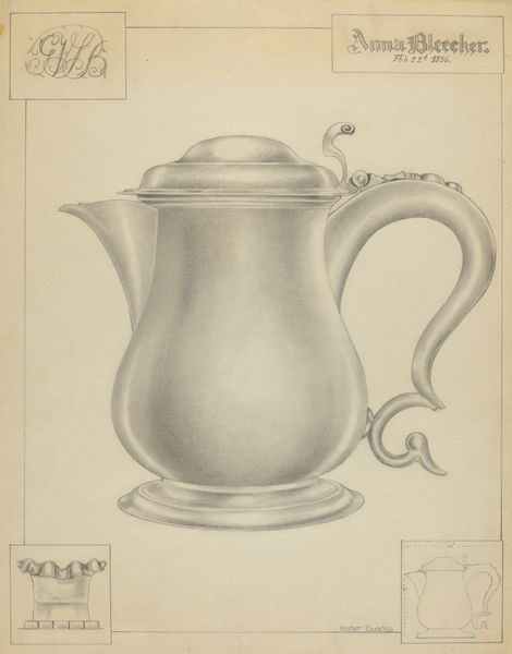 Editor: Here we have "Silver Tankard," a pencil drawing made around 1936 by Isidore Steinberg. It depicts, unsurprisingly, a tankard. What I find immediately striking is the detail and precision rendered simply with pencil. What's your take on this piece? Curator: It's interesting to consider this drawing not just as a representation, but as evidence of labor. Steinberg meticulously records the form, surface, and even reflections of this tankard. The process of translating a three-dimensional object into a two-dimensional drawing forces us to acknowledge the hand that guided the pencil. Is this simply documentation or is it also a commentary on craft and production during that time? Editor: That's a great point, seeing it as labor frozen in time. The addition of that smaller, almost diagrammatic sketch in the corner really reinforces the sense of design and meticulous planning behind it. Do you think the medium, pencil, adds or detracts from its impact? Would it be different as a photograph, or a fully realized silver object? Curator: The pencil, in its simplicity, democratizes the object. Silver suggests wealth and privilege, while pencil, a more accessible medium, transforms the tankard into a reproducible image. The drawing then becomes a design object, potentially circulated widely for production purposes or a craftsman’s catalog. It moves beyond its singular preciousness. Consider the context - 1936 and potentially coming out of the depression. Access to precious materials may have been limited. Editor: So, it becomes more about the *idea* of the tankard rather than the tankard itself. I'm starting to see it as almost a blueprint rather than a piece of art. Curator: Exactly. We have to challenge those traditional boundaries, seeing it less as an aesthetic object and more as a document embedded in a specific system of making. This piece forces us to reconsider what we consider "art" and where design and craft intersect. Editor: This reframes my view. It is less about admiring the silver and more about appreciating the act of its creation and its place within a broader economy. Thanks for your perspective! Curator: My pleasure. Seeing art through the lens of materials and production reveals so much about the societies that produce them.