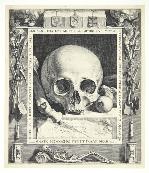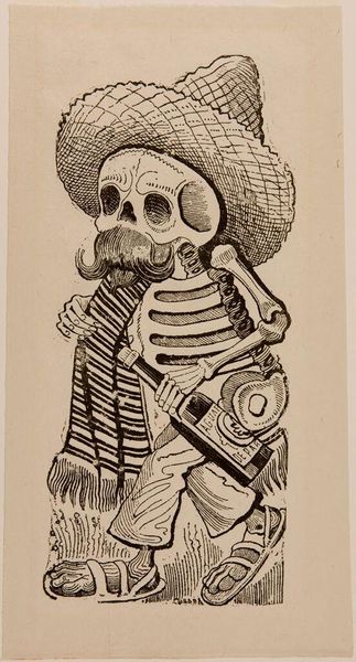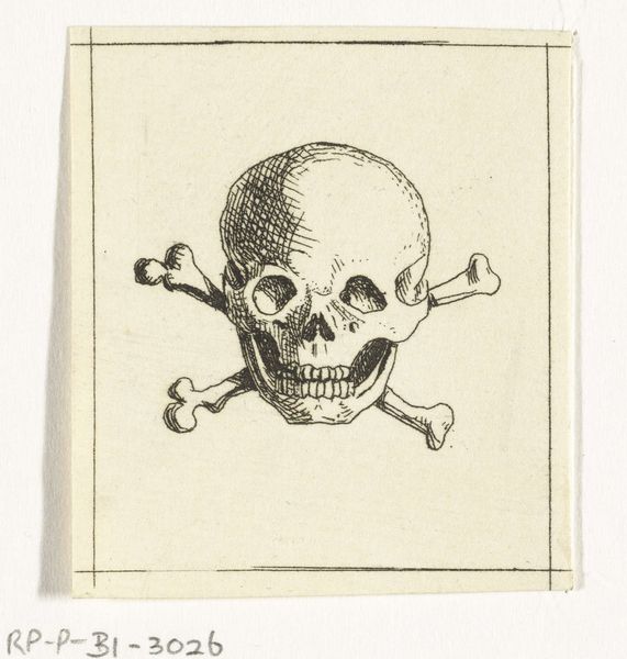 Curator: Let's turn our attention to a compelling drawing: M.C. Escher’s “Skull with Cigarette” from 1917, rendered in graphite. Editor: Immediately striking! There's a playful macabre feeling...almost like a grim joker. The top hat juxtaposed with the skull is a real power move. Curator: It’s hard to ignore that tension, isn’t it? The hat certainly elevates the skull, almost satirically. The cigarette, jutting jauntily from the teeth, further enhances this somewhat sardonic portrayal of death. What symbolic readings do you glean? Editor: The skull, obviously, is our "memento mori," but Escher gives it this added layer of swagger with the cigarette and dapper headgear. He's personifying death, perhaps hinting at society’s flirtation with it. Or, more simply, the transience of earthly pleasures—a bit of vanitas there. Curator: That interpretation resonates with Escher’s broader themes, don’t you think? A young man exploring the ephemeral, even the absurd. I feel it’s an introspective piece about confronting one’s mortality with both anxiety and dark humor. He was just 19 at the time! Editor: Incredible! That imbues it with so much more weight. The contrast between the smooth hat and textured skull further amplifies that reading; like two sides of the same coin of existence. Curator: Right, the textures add dimension. The relatively simple graphite work actually belies a much more complex interplay of ideas regarding mortality and self-perception. And the added twist? Maybe he knew something we didn't about smoking habits! Editor: I love it! From youthful grappling with existential themes to potent symbolism delivered with irreverent humor...it’s a tight little package of life and death. Curator: It’s a perfect reflection on a young man considering life and death during a particularly brutal war era; still impactful after more than a century.
