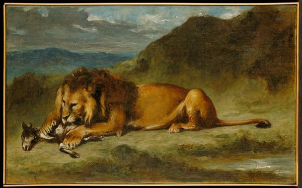 Eugène Delacroix painted this watercolor, Lying Lion in a Landscape, during the Romantic era, a period when artists explored themes of emotion, individualism, and the power of nature. Delacroix's choice to depict a lion is quite telling. The lion, often seen as a symbol of power and dominance, is rendered here in a state of repose, almost vulnerability. What does it mean to see this symbol of strength resting in the landscape? Is it a meditation on the relationship between power and vulnerability? The subtle use of watercolor allows for a fluidity that softens what could be a more rigid portrayal of the animal. The background hints at a wild, untamed world which enhances the lion’s connection to raw, natural power. Delacroix seems to suggest that true power lies in the ability to be at peace with oneself and one's surroundings.