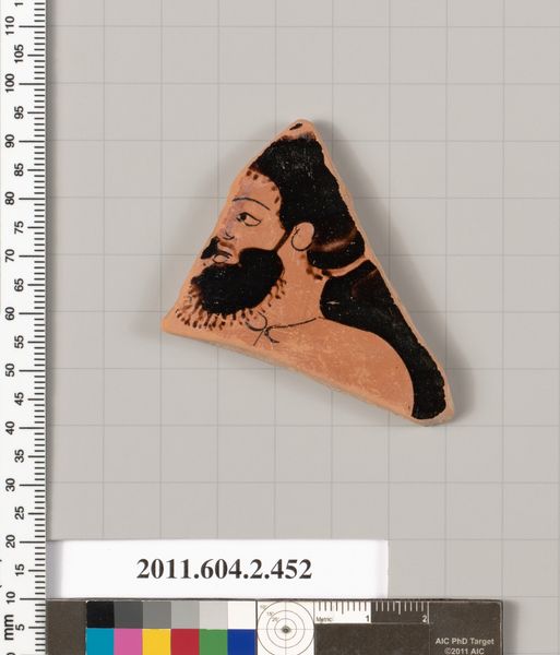 This is a fragment of a terracotta kylix, or drinking cup, made by Makron, an Athenian vase painter known for his work in the red-figure technique. Pottery like this was made in ancient Greece, a society deeply structured by class, gender, and civic identity. Athenian society was patriarchal, and the symposium, where kylixes like this were used, was an exclusively male space. The imagery painted on these cups often reflects the values and social dynamics of the elite male citizens who used them. Though this is just a fragment, one can imagine the scenes of revelry, mythological narratives, or athletic competitions that might have adorned the complete vessel, offering a glimpse into the worldview of ancient Athenian society. The act of drinking together was more than just refreshment, it was a ritual, and the kylix itself, a canvas for expressing cultural identity and social norms.