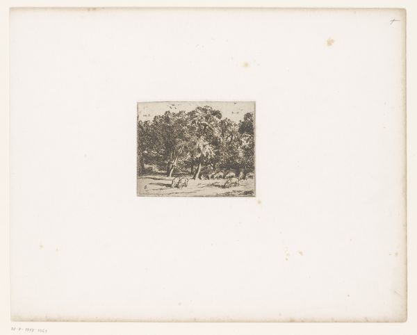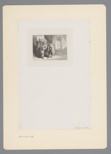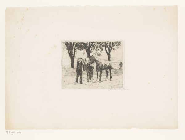 Curator: This print by J. Ursel from 1875, aptly titled "Two Coachmen by a Carriage," presents a rather understated scene, doesn't it? Editor: It does, quite modest, nearly melancholic, perhaps; it definitely conveys a sense of weary stasis with those drooping horses. The light and shadow play across the forms seems quite muted, as if even time is slowing down. Curator: Indeed. Let’s consider the structure, though. Ursel has used etching here, a printmaking technique that allows for a fine level of detail, albeit in a monochrome palette. Note how the spatial organization relies on a somewhat minimalist composition, directing the eye primarily to the human figures juxtaposed with the animal element of horses, bound together by that technological innovation we know as the carriage. Editor: That pairing is striking—men, horses, machine. I am immediately thinking about status, power, the control of nature—symbols that stretch back millennia. Horses themselves were deeply coded in the collective imagination well before mechanisation began to alter societies’ relation to them. Look how diminished in size those coachmen are relative to the composition! Curator: An interesting reading, particularly considering the class implications inherent in such displays of wealth at the time. What fascinates me from a more purely visual point of view is how the stark white paper both isolates and integrates the representational forms, serving almost as an abstract grounding that prevents this tiny image from collapsing into a purely anecdotal genre painting. The texture of the paper stock contributes to that, doesn't it? Editor: Certainly. I notice the very dark coloration given to the people: there are very stark contrasts between these tiny figures and their supposed social betters who would travel in the carriage they drive. That feels deliberate, a potential, quite subtle, commentary from the artist. Curator: Yes, I suppose one could read those sharp contrasts in value that way. In purely formal terms, I'd suggest the contrasting tones simply function to separate out the spatial planes and focus attention toward the scene's heart. Ultimately it serves as a study in restrained, balanced design within very narrow artistic boundaries. Editor: I am leaving with this strong feeling of constraint—on the coachmen, yes, perhaps on Ursel, but it is undeniably affecting. The emotional dimensions held within those etch marks seem, somehow, immense. Curator: A suitably evocative parting thought on a very concise, careful etching from the late nineteenth century.