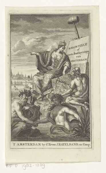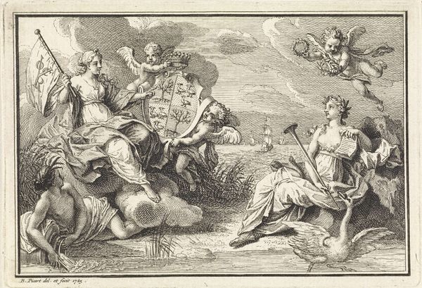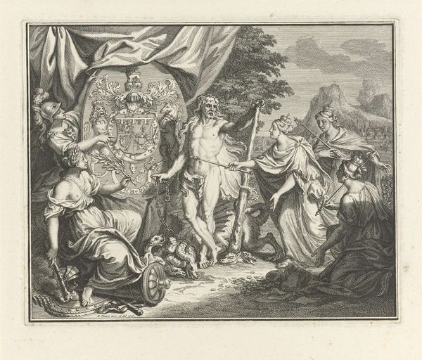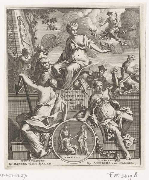 Curator: Pieter de Jode I created this engraving, "Gezicht," sometime between 1590 and 1632. It currently resides here at the Rijksmuseum. What strikes you upon viewing this print? Editor: Immediately, I’m drawn to the tonal range achievable through engraving, it gives real depth despite being on paper. And that light emanating from the top left! The strong diagonals in the composition lead the eye through different characters with incredible effectiveness. Curator: Indeed. De Jode was part of a larger artistic community, a network fueled by the booming printmaking industry in Antwerp. Prints allowed for the rapid dissemination of ideas, influencing taste and transmitting social and political commentary. Editor: Absolutely. If we consider how de Jode arranged forms in this engraving, Jupiter strikes with his scepter an allegorical representation of sight while he is on top of draped cloth and there's a very peculiar chicken in the foreground. The central woman with the basket, together with the male figure that looks like an old wanderer is full of movement while creating a strong contrast with the stationary god figure. Curator: The allegorical figure "Visus" represented with that woman reading a book shows sight's importance through her focus on scripture or perhaps scholarly works. The older man carrying his belongings speaks to everyday experiences shaped by how we perceive the world. Consider also the relationship with other artisans in de Jode's workshop. He relied on skilled laborers for everything from preparing copper plates to distributing finished prints. Editor: The lines that construct the images invite viewers to actively engage in visually completing it. How de Jode layered and contrasted each line gives rise to distinct and subtly shifting tones which produces movement. This makes me think of similar formal relationships in mannerist painting from the time. Curator: By considering the engraving practices, dissemination networks and socioeconomic factors influencing de Jode's practice, we begin understanding that prints weren't autonomous aesthetic objects, but active participants of historical dialogues, informing belief and directing actions. Editor: I concur. By acknowledging this artwork’s composition through allegorical representation and its textural qualities within its historical context of material and means of production we see it not as merely aesthetic artifact, but a confluence of human skill and creative output from a long gone time.