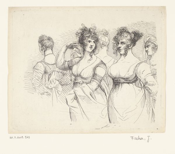 Curator: This delicate watercolor, simply titled "The Dance," is by Henry William Bunbury, an English caricaturist who lived from 1750 to 1811. Editor: There's a breezy lightness to it, wouldn’t you say? The figures almost float across the page, and the colors are so gentle. Curator: Yes, Bunbury’s technique relies on a subtle use of line and wash, creating a sense of movement and fluidity. Notice how the composition is structured around the implied circularity of the figures’ linked hands. Editor: I’m struck by how the women’s postures—their outstretched arms, their flowing dresses—speak to ideas of female solidarity and perhaps even resistance against societal constraints during that era. Curator: It's certainly an intriguing interpretation, and I see your point. However, I wonder if we are perhaps projecting too much onto what may simply be an exploration of form and balance. Editor: Maybe, but art history is more rewarding when it connects with social history. Curator: Indeed, but in this case I appreciate how Bunbury’s composition and delicate rendering create a vision that transcends any specific historical context. Editor: I concur. It's intriguing how the artist invites such varied readings.