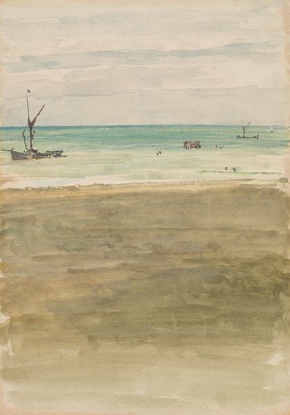 Curator: This is James Abbott McNeill Whistler's "Study for Mouth of the River," created around 1877. It's an oil painting that wonderfully captures the maritime atmosphere of the late 19th century. Editor: It’s kind of moody, isn’t it? The light is so muted, like looking at a memory of a seaside town rather than the thing itself. And that beach looks vast and empty. Curator: The use of watercolor and oil is interesting; Whistler often combined materials, defying academic expectations. Notice how the social and economic changes driven by industrialization are reflected here with a focus on commerce. Ships, perhaps bringing goods, dominate the river mouth. Editor: Absolutely! It almost looks like the industrial age is emerging from the sea itself in a fog of steam. I find myself thinking about transience; it captures how people interact with these massive, shifting environments. The ships aren't static; the smoke in the sky implies motion and change, suggesting constant evolution, you know? Curator: Indeed. Whistler engaged in a discourse related to modernity. This work reflects not just his aesthetic pursuits but also wider themes of societal change as a result of urbanization that marked art's role within this evolution. Editor: To me, it evokes something personal – the feeling of standing on a beach alone, the smell of salt and distant smoke. What do you take away from the beach colors in contrast to the greys of the horizon, in relation to a city scene? I mean, look how simple he captured those docks; amazing. Curator: What is beautiful about examining artworks such as this are their position between industry and society. His pieces were also quite polemic within impressionist circles due to his preference in how people appreciate it, and not necessarily what their intentions were. The goal was beauty for beauty. Editor: And here we are discussing its context, huh? Well, this was fun; it shows how beauty opens dialog across perspectives. It leaves a lasting thought on how ephemeral art can still be. Curator: Precisely, the enduring legacy of art rests upon its capacity to continually provoke thoughts, enabling cultural interpretation through shifting contextual understanding!