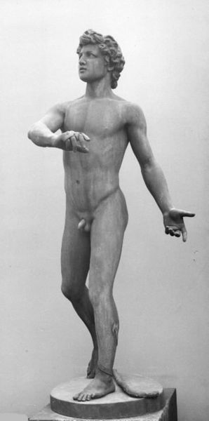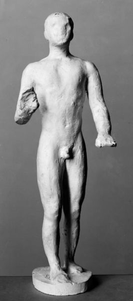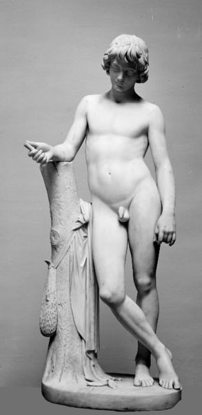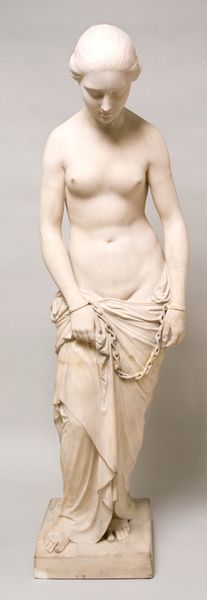 Curator: This arresting sculpture, "Merkur," was completed in 1821 by Hermann Ernst Freund. Fashioned from marble, it's a compelling example of Neoclassical sculpture currently residing at the SMK in Copenhagen. Editor: It exudes a sort of quiet resignation, wouldn’t you agree? His gaze is lowered, and there is an air of restraint that subverts the very idea of the 'messenger' deity. It makes me think about what voices aren't represented by history. Curator: His contrapposto stance lends dynamism to the piece, while the polished marble skin exudes an almost luminous surface texture that draws one's eye. Note also the precision in the carving of the caduceus and winged petasos - true signifiers of his station and tools of his office. The lines here speak to a sophisticated understanding of form and proportion. Editor: While those objects might act as clear signifiers, I am prompted to wonder: to what extent does this work reflect early 19th-century European cultural fixations on the male nude? Or even more complex questions related to empire. It's impossible to look at this object and not wonder about Freund's own context. Curator: These aspects don't negate its skillful rendition of classical ideals, but provide other perspectives of understanding, or additional analytical coordinates, if you will. Observe his slender build and smooth, uninterrupted contours. A powerful emblem of restrained heroism. The emphasis on pure form, and simplified anatomy adheres strongly to Winckelmann’s notion of "noble simplicity and quiet grandeur.” Editor: Restrained perhaps because the actual bodies represented here often contrast against those depicted in idealized art? This contrast makes me ask whose 'ideals' were amplified during Neoclassicism, and what bodies are marginalized or erased by them. What social norms did this perpetuate and naturalize? Curator: That tension is evident, providing us with additional layers to understand his rendering, and adding critical weight to what we see—formally speaking—in front of us. Editor: Absolutely, and thank you for that reading. I'm struck by how viewing "Merkur" with the full complexity of that era helps uncover many nuanced tensions that we can unpack even today.