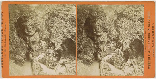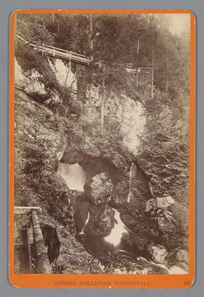 Editor: This is a photograph titled "Gollinger Waterval," taken sometime between 1872 and 1886, likely by Anton Seif & Co. The striking contrast between light and shadow is remarkable, almost dramatic, drawing the eye immediately to the waterfall. How do you approach this photograph? Curator: Primarily, I consider the formal elements at play. Observe how the composition utilizes a strong vertical emphasis, accentuated by the cascading water. The textures are critical – the rough, uneven surface of the rocks contrasts with the soft, blurred effect of the water in motion. The value scale, ranging from the deep blacks in the shaded areas to the brilliant whites where the water catches the light, generates a palpable sense of depth. Note, also, how this range contributes significantly to the photograph's aesthetic power. Does it convey that feeling effectively? Editor: It does, it almost feels tactile. But what about the bridge in the background? Is it more than just a visual element? Curator: The bridge, placed strategically in the upper section of the frame, functions as a secondary point of focus, serving to counterpoint and subtly reiterate the relationship between human-built constructs and naturally existing, dynamic structures. Furthermore, it contributes to a sophisticated visual layering. What relationship do you think it provides to the central visual field? Editor: That makes sense. It's like it’s giving us a human perspective, contrasting our controlled architecture with the wildness of nature. I was missing how that structured the image. Thanks for clarifying the formal interplay in this photograph. Curator: It's through careful examination of form that we truly unlock the intended impact of the work. Considering how elements work to serve its intended meaning reveals something of ourselves, too.