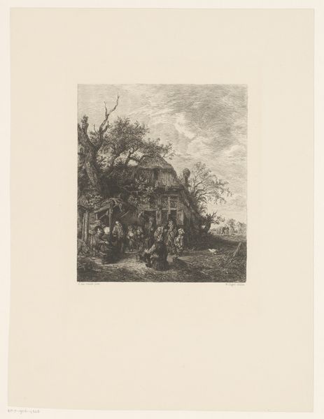 Polynice Auguste Viette created this print, "Volgeladen wagen met bovenop moeder met kind," using etching, a technique known for its fine detail and capacity to capture texture. The process begins with a metal plate covered in a waxy ground. The artist scratches away at this coating, then bathes the plate in acid, which bites into the exposed metal, creating lines. Ink fills these lines, and when pressed onto paper, it produces the image. Viette has used the etching to great effect. Notice how the intricate network of lines creates a sense of depth and three-dimensionality, almost making the scene jump off the page. It vividly depicts the heavy burden of everyday life, the labor of pulling the overloaded wagon, and the mother and child perched precariously on top. This artwork, made through a process of careful labor, reminds us of the physical labor depicted within the image itself. It collapses the divide between the making and the made.