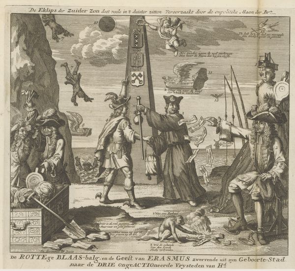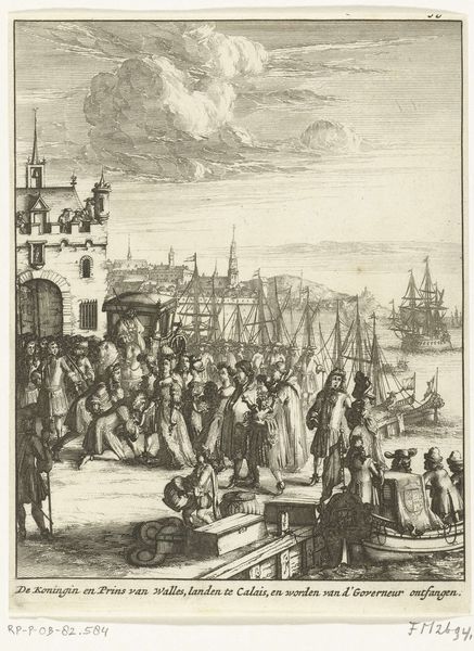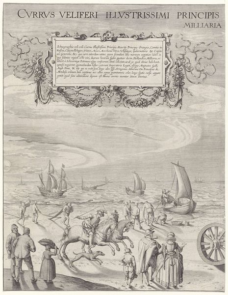 Curator: Let's pause here in front of "Profile of Amsterdam, Seen from the IJ," created by Claes Jansz. Visscher in 1611. Editor: My goodness, the details in this etching and engraving pull you right in! It feels like a stage where commerce and daily life intertwine, under this massive fleet that kind of dwarfs everything. A little gritty, too, like hard work in plain sight. Curator: Visscher certainly captured Amsterdam’s burgeoning energy, didn't he? Look at the foreground; the hustle of ordinary people set against the backdrop of its maritime power. You see vendors, sailors, the everyday transactions that fuel a great city. Editor: I do. It's almost romantic, this dedication to representing the lives that are enmeshed with larger sociopolitical systems. And the materiality—engraving allowed for such minute articulation of detail. It becomes almost obsessive in the rendering of textiles and goods! These are ordinary people, moving and working… but also posing as evidence of their hard work being memorialized. Curator: Engraving really brought images to a broader audience. Visscher cleverly balanced the overall composition; that decorative cartouche, like a crowning glory atop the image. It frames Amsterdam, quite literally, as the bustling center of the world, a hub of trade and progress. And, yet, that human presence in the front lends an intimacy to what could have just been an official city portrait. Editor: Yes! And speaking of intimacy, can we discuss the underbelly? I'm noticing elements within the labor of crafting engravings; the ways the lines create texture; the burin moving across metal—the sheer manual labor inherent in this artwork mirrors the image, echoing those maritime ambitions with labor! The labor it requires to run the city and to represent the city intersect with one another. Curator: An excellent point. It’s almost a layered representation of creation. You see Visscher, through his detailed rendering, celebrating not just Amsterdam’s achievements, but also implicitly the skill and labor required to even capture its essence. There's that real grit and truth! Editor: Precisely. Ultimately, seeing all this layered in—I get a sense of human scale—but also the ambition, like these are human lives under pressure to meet capitalist ambition. Curator: I agree completely. I always come back to the liveliness present amidst all those rigorous lines, an energy of invention that makes it feel more like a poem about the city rather than just a portrait. Editor: Indeed, it is almost like this is a material testament. Thanks, Visscher, for offering this layered reflection through both subject and process.
