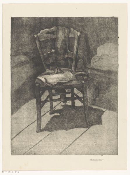 Curator: What an interesting drawing, somehow familiar, like a memory of a place I’ve never actually been. Editor: I agree! We are currently looking at Carel Nicolaas Storm van 's-Gravesande's "Kamerinterieur in de Rue du Trône 190 te Brussel." It's a pencil drawing from between 1851 and 1924 and is part of the Rijksmuseum's collection. What exactly speaks to you? Curator: The mood is so heavy, thick with quiet contemplation. And the use of only pencil—no riot of color—makes the whole thing feel so intimate, as though we’re peering into a very personal space. Editor: It's definitely an exercise in tonal control. All that nuanced grey brings a kind of symbolic weight to those depicted items—especially that chair. What do you make of its central placement, given that interior spaces, since the Renaissance, often stand in for inner states? Curator: The chair looks very regal, yet worn—a silent throne. Could be symbolic of a past life of status. And notice the placement. It’s a barrier; preventing the viewer from fully entering the room. It feels both inviting and forbidding, doesn't it? Like there are stories just beyond our reach. Editor: I notice the mirroring, both literal, in the mirrors hanging above, and suggested: The shape of the chair is echoed in the frames around the prints. This emphasis on framing suggests an exploration of selfhood but one filtered through representations and echoes of other possible selves. Curator: Right, like echoes of a life lived, or multiple versions of it, hanging on the walls. I wonder, is that how Van 's-Gravesande saw himself, reflected back, a collection of impressions of past roles? And that dark corner on the right, the portal or a place of secrets? The details offer depth far beyond the materials and realism. Editor: It becomes a meditation, doesn’t it? That shadowy doorway offering an invitation—or a warning—to the rooms within ourselves. Well, this visit to the artist’s room has given me some ideas for renovations in my own living room! Curator: Absolutely! This space has the sense of a captured atmosphere. I think this artwork is about understanding and interpreting visual storytelling through everyday symbolism.
