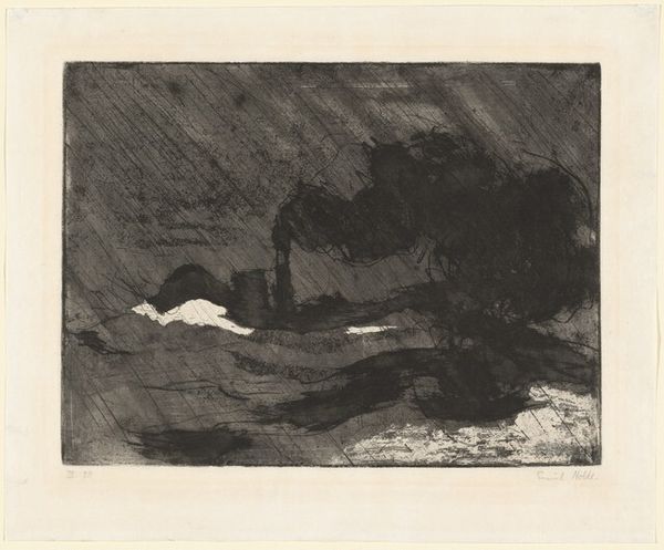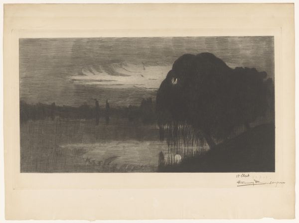 Editor: Here we have Willem Witsen's etching, "Gezicht op Waterloo Bridge in de mist in Londen," created around 1890. It's currently held in the Rijksmuseum. The overwhelming darkness immediately strikes me. What formal qualities do you see in this piece that stand out? Curator: The most compelling aspect is Witsen's masterful control of tonal values. Observe the limited, almost monochromatic palette. The composition relies heavily on chiaroscuro to create depth and atmosphere. Note how the dark, almost impenetrable mass of the foreground contrasts with the delicate, ethereal rendering of the background lights and the bridge's suggestion. Editor: Yes, it's interesting how the light seems to be both obscured and enhanced by the fog. How does that limited palette contribute to the overall reading of the piece? Curator: Precisely. The restrained palette intensifies the feeling of mystery and perhaps even a sense of isolation. The blurred edges and lack of sharp details further contribute to the atmospheric effect. Consider also the role of line in creating reflections on the water and the sense of depth that adds to the formal qualities. Editor: So, the form itself—the composition and use of light and shadow—becomes the primary vehicle for meaning, overshadowing any literal depiction of the scene. Curator: Exactly. Witsen isn't merely representing Waterloo Bridge; he is constructing a visual experience that prioritizes atmosphere and the interplay of light and dark. How does the small boat influence your reading of the formal structures? Editor: I suppose its inclusion anchors the scene, and acts as a sort of middle ground for your eye, between the reflected lights above, and the overwhelming darkness. I never noticed the semiotics within the print-making process, thanks for that breakdown. Curator: My pleasure. Thinking about the print's design really emphasizes its strengths.