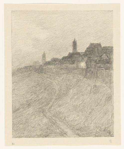 Curator: This intriguing print is titled "Hoektoren van een burcht," which translates to "Corner Tower of a Castle," dating from between 1867 and 1910, attributed to Etha Fles. Editor: Oh, it's all atmosphere, isn't it? So wispy and somber! The texture almost feels like faded memory. Is it meant to evoke nostalgia, do you think? Curator: Absolutely! Etchings such as this, made with fine lines on paper, really capture a romantic sensibility, calling back to the past. See how the monochrome adds to the sense of something aged? Editor: Right! I immediately key into that Romanticism. It makes me think about ruin aesthetics... the way these remnants of imposing architecture remind us of time's passage. Like the tower itself, seemingly crumbling in monochrome dust. Curator: Precisely. The geometric forms suggest stability but the misty application almost completely contradicts that. Do you find any symbolic meaning in the bare tree next to the tower? Editor: Ah, the lone, windswept tree. Probably some nod to resilience and the endurance of nature versus the built world, though there's sadness there too. Trees carry an enduring significance. Curator: It reminds me of similar symbolism employed during that era in other prints and paintings--endurance, resistance. How these historical structures, these visual motifs, can reflect changing societal values, don't you agree? Editor: Oh, indubitably. This little landscape acts as a visual symbol and holds all sorts of narratives for whoever chooses to engage. Thanks for that insightful look! Curator: And thank you for offering your unique reflections. It adds an intimate perspective to seeing this work in its broader context.