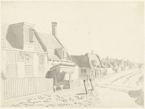 Curator: Ah, here we have "View of Zoutelande," a print, etching, and drawing created in 1792 by Jan Bulthuis. It resides here at the Rijksmuseum. What’s your take as we approach? Editor: Well, right away, there's a calmness to it, despite the slightly ominous clouds overhead. It feels like stepping back in time, the scene steeped in this sepia stillness. The rooftops all slant, like whispers agreeing with the wind. Curator: It’s intriguing, isn’t it, how Bulthuis captures the domestic rhythms of the village? Note the material reality, all these repetitive tasks. There are people seated, at labor right on the doorstep. Observe how labor manifests itself right in the construction of the thatched and tiled roofs. The materials at hand dictate form, an unpretentious relationship with available resources. Editor: Exactly. And somehow, despite the realist depiction, there's an underlying symbolism here, perhaps unintended. This persistent cycle of domestic labor. How people persist, building homes with what is at hand. What stories do you imagine from looking into the distance? Curator: I’m more attuned to the foreground, the here and now. What sort of paper did Bulthuis use? Who printed this? It brings up larger considerations of art as work, art as craft. Not just an object of aesthetic appreciation but of labor, and what that says about social dynamics and value. It seems so at odds with later romanticism and emphasis on artist as tormented solitary genius, don't you think? Editor: It does, and maybe there’s also some resistance inherent to Neoclassicism. After all, it was birthed amidst the French revolution. But I feel the hint of a greater world in the cloudy sky. It evokes that longing, which might come about due to seeing this scene repeated day after day. Curator: I understand your longing. It gives an additional layer when seeing the means of production and thinking of consumption in society, especially as this piece comes into our present. A way of grappling with societal implications by considering how it came into being. It almost grounds the work for me. Editor: Well, thank you. That material grounding almost liberates me to just look at the art differently, as an individual expressing both the limitations of reality, as well as what escapes those constraints.