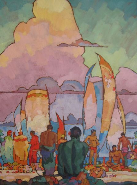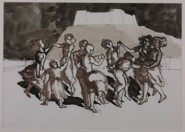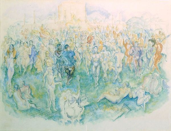 Curator: Standing before us is Aaron Douglas's striking tempera painting, "From Slavery Through Reconstruction," created in 1934. It's a mural-sized work that's a powerful statement about Black history. Editor: The sepia tones create a kind of visual echo of old photographs. It lends this really poignant atmosphere to the composition. Curator: Absolutely. Douglas, a major figure in the Harlem Renaissance, uses this visual language to portray the struggles and triumphs of African Americans, starting with the harrowing reality of slavery. Notice the figures to the left, bent under the weight of their burdens in the cotton fields. Editor: The rhythm of the repeating figures evokes both the monotony and the physical hardship they endured. I see the concentric circles that radiate throughout the painting, visually linking the different historical moments that are shown. Curator: Yes, that's Douglas’s signature style. Those concentric circles emphasize a sense of movement and connectivity, showing how events reverberate through time. In the center, a figure stands tall, seemingly an orator or leader pointing towards a new direction. This shift highlights Reconstruction-era progress. Editor: I appreciate how the geometric shapes make this complex subject accessible. Douglas distills forms into planes. It feels very modern, in terms of abstraction. Curator: Douglas aimed for accessibility in his public art. His art was socially engaged, and he used murals like this one to educate and inspire his audience during a critical period of American history. It’s a part of a series about Black achievement. Editor: Looking closely, one cannot deny the enduring narrative this painting carries—oppression, resilience, and then, the hopeful ascent into reconstruction. Curator: Douglas used his artistic voice to contribute meaningfully to the political and cultural landscape of his time. The visual language is so powerful in the narrative that the painting is relating. Editor: Its masterful synthesis of form and subject really does amplify the power and the perseverance embedded within this narrative.