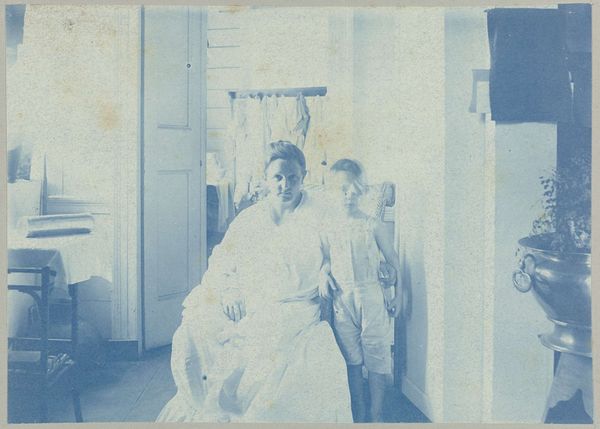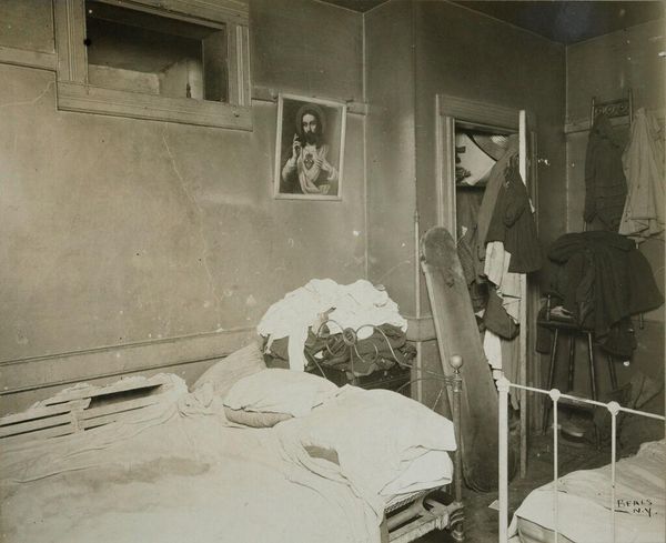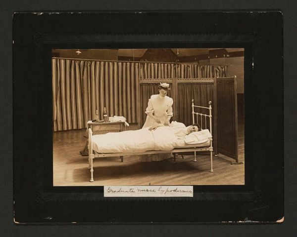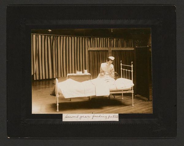 Curator: Here we have a photograph from between 1917 and 1918, titled 'Eckart Titzenthaler, zoon van de fotograaf, in de slaapkamer van het woonhuis in de Friedrichstrasse, Berlijn', which translates to 'Eckart Titzenthaler, son of the photographer, in the bedroom of the house in Friedrichstrasse, Berlin' and it was taken by Waldemar Titzenthaler. Editor: It’s quite a moody photograph, isn't it? The soft sepia tones and the subject matter, a child in a bedroom, give it an intimate, almost melancholic feel. The light is diffused, making the textures in the bedding and the child’s nightgown quite tactile. Curator: Precisely. Waldemar Titzenthaler was known for capturing scenes of everyday life in Berlin. This photograph offers us a glimpse into the domestic sphere during a tumultuous period in German history, the end of the First World War. Editor: It's interesting how the mundane aspects of life—like putting a child to bed—continued despite the surrounding chaos. What strikes me, though, is the very deliberate crafting of the image itself. The quality of the print; you can almost feel the weight and weave of the paper used, connecting the photographic print back to material means of production. Curator: Certainly. Photography in this era was still a relatively involved process, not the instantaneous image-making we know today. The photographer's choice of subject and the staged domesticity reflected the cultural values of the time, presenting a carefully constructed image of family life. Editor: But even staged, there is still evidence of manual production—from posing the child to the final print in sepia tone. The final product offers this view of "genre painting," while showcasing how labor is rendered invisible within the domestic and the aesthetic spaces it depicts. Curator: These images, seemingly simple at first glance, acted as social documents, shaping and reinforcing ideas about childhood, family, and national identity in the aftermath of war. Editor: Absolutely. When considering the photograph today, we can think about both the moment and how images operate in constructing larger ideas, beyond that particular child in that particular room in Friedrichstrasse. Curator: A quiet reminder of personal stories playing out against the grand narratives of history. Editor: A material echo connecting then and now.