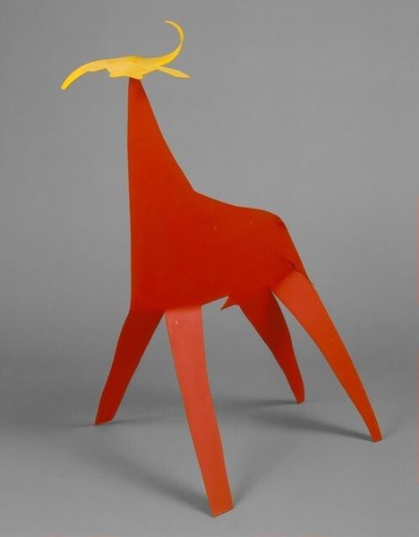 Here we have Alexander Calder's striking sculpture, "Black Camel with Blue Head and Red Tongue," standing at just over 53 centimeters. The sculpture presents a captivating study in contrasts, primarily through its stark black body juxtaposed against the vibrant blue and red accents on the camel's head. Calder masterfully utilizes metal strips to define the camel's form, reducing it to its most essential lines and curves. This simplicity lends the piece an abstract quality, challenging our perception of the familiar. The unexpected choice of colors—a cool blue for the head and a fiery red for the tongue—introduces a playful yet unsettling dynamic, destabilizing the naturalistic expectations one might have for such a subject. This bold color contrast draws attention to the head, disrupting the overall structural flow and prompting us to reconsider the symbolic implications of these colors. The sculpture operates within a semiotic system, where color and form intersect to create new layers of meaning.