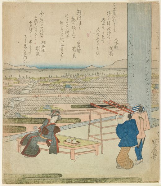 This woodblock print, made by Ryūryūkyo Shinsai in Japan around the early 19th century, depicts three women in a garden setting. It’s a beautiful example of Ukiyo-e art, or "pictures of the floating world," a genre that flourished during the Edo period. Here, the image creates meaning through its depiction of leisure and refined taste, reflecting the values of the merchant class who were increasingly influential at the time. Consider how the delicate lines, subtle colors, and focus on everyday life contrast with the more formal art favored by the ruling elite. This print, and others like it, signaled a shift in patronage and artistic expression, capturing the spirit of a changing society. They were mass produced, so the rising middle class could afford them. Understanding this print requires us to consider not only its aesthetic qualities, but also its place within the social and economic landscape of Edo-period Japan. By examining historical documents, literary sources, and other visual materials, we can gain a deeper appreciation for its cultural significance.