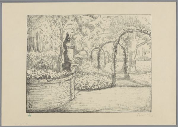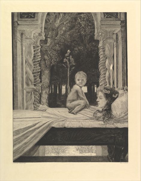 Max Klinger created this print, "At the Gate," as part of his series "A Love," using etching, drypoint, and aquatint on paper. Klinger wasn't just any artist; he was a master printmaker who pushed the boundaries of these intaglio techniques. Look closely and you will notice that he combined them to achieve a wide range of tones and textures, from the velvety blacks of the shadows to the delicate, almost ethereal quality of the foliage. The aquatint gives a soft, atmospheric effect, while the etching and drypoint provide sharp, precise details. Consider that Klinger would have needed considerable technical skill to control the acid, pressure, and timing involved in these processes. In his social context, Klinger elevated printmaking to an art form on par with painting and sculpture. By emphasizing the labor-intensive process behind the image, Klinger challenges the traditional hierarchy between craft and fine art, reminding us that skill and technique are essential to artistic expression.